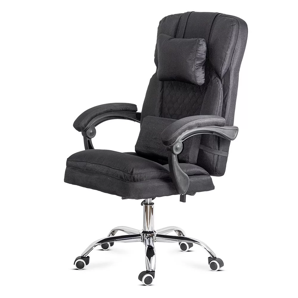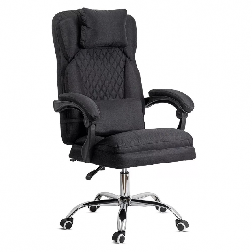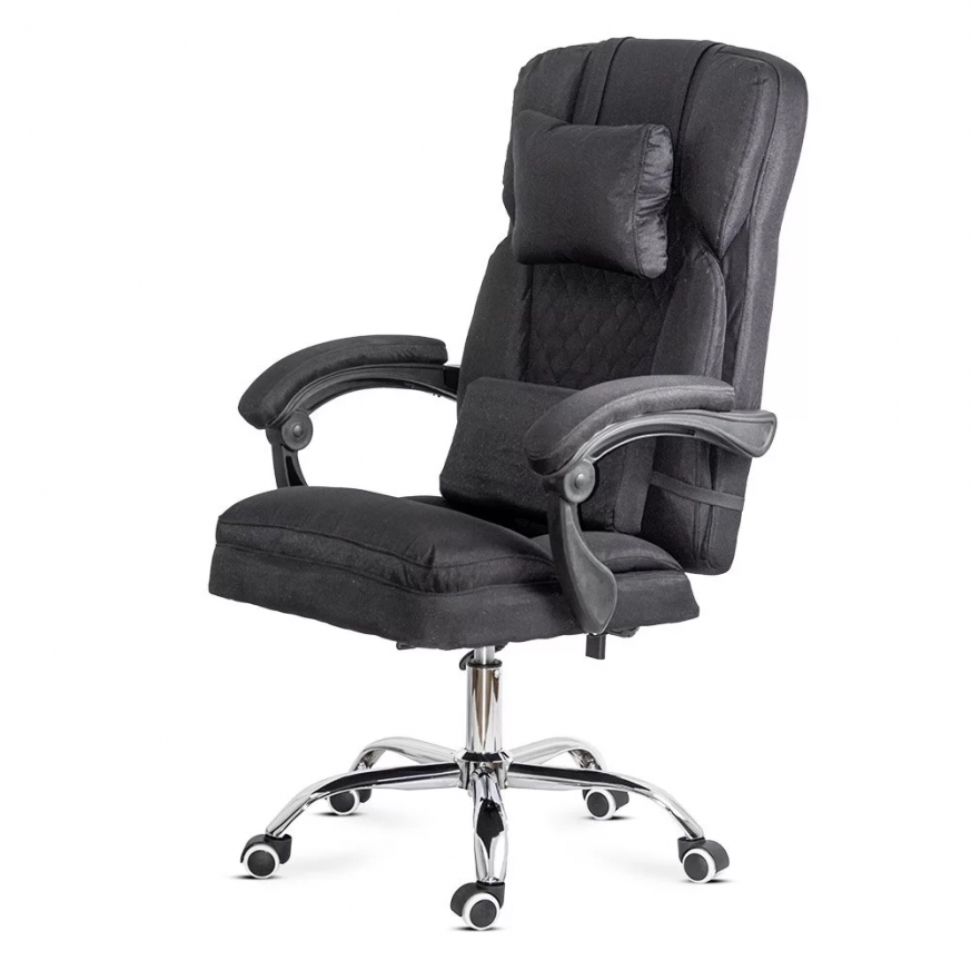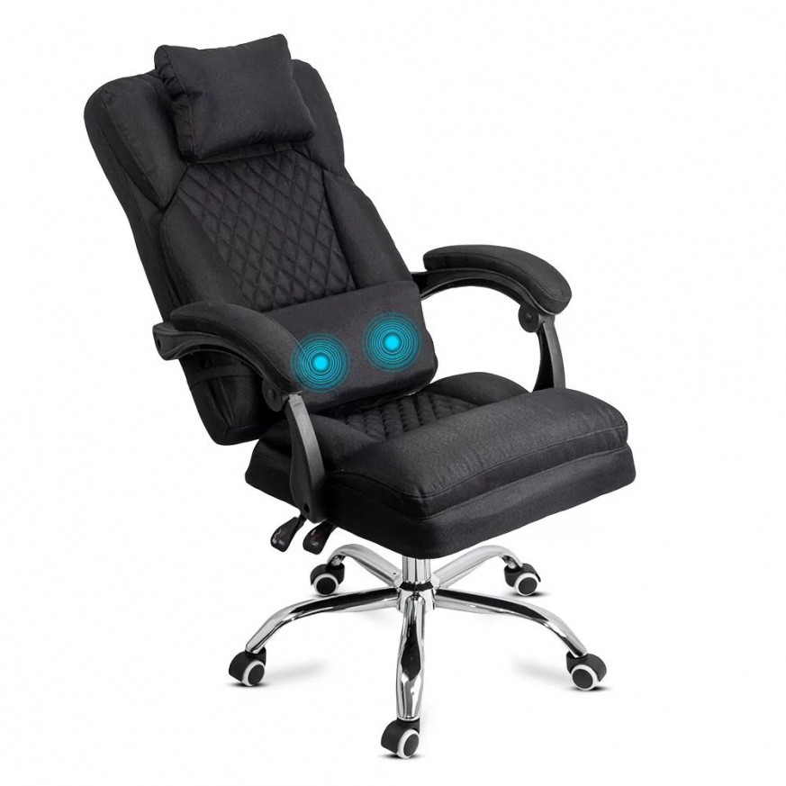 Модерният офис стол Alfredo от черен плат с метална основа и масажираща лумбална възглавница се отличава със своята здрава метална основа и гумирани колелца,. С A-синхронен механизъм, столът предлага възможност за лесно регулиране на височината и ъгъла на облегалката, което ви позволява да намерите перфектната позиция на седене. В допълнение, облегалката може да се наклони до 135 градуса , за моментите, когато имате нужда от релаксираща почивка.