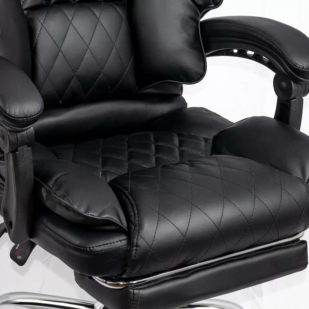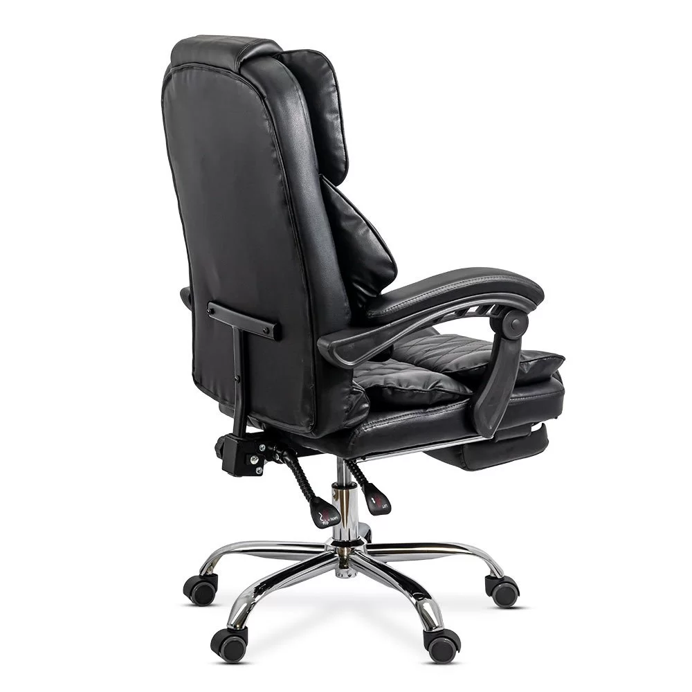 Столът е оборудван с разтегателна поставка за крака, идеална за почивка, и хромирана метална основа с пет точки на опора, осигуряваща отлична стабилност и мобилност.