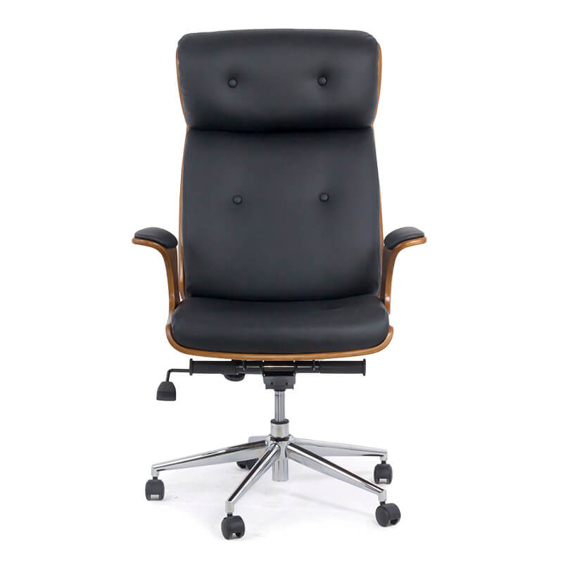 Снабден е с елегантни извити подлакътници от дърво с еко кожа, хромирана стоманена основа и колелца за пълна мобилност.