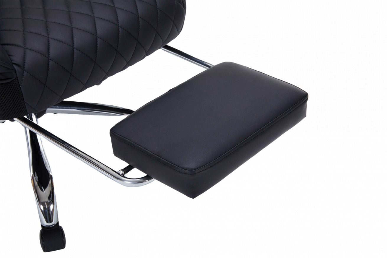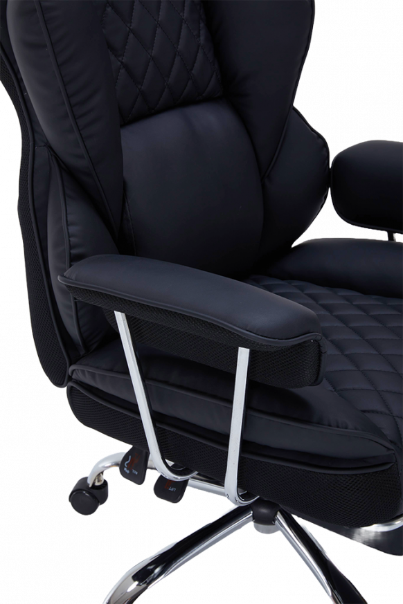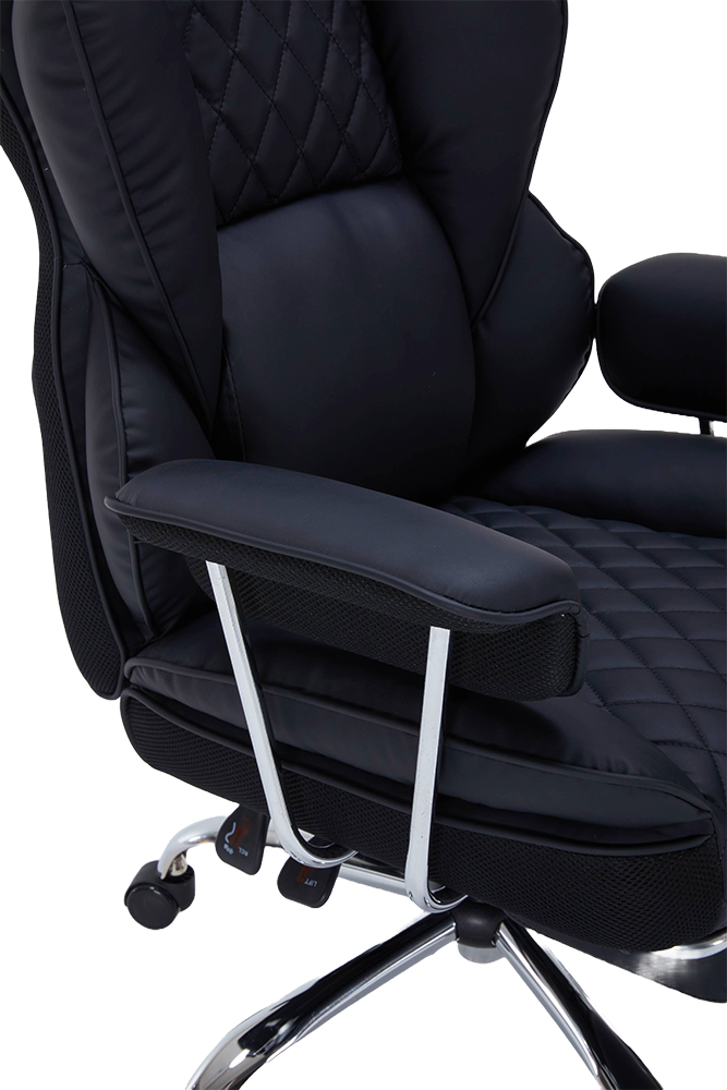 За още по-голям комфорт, столът разполага с вградена облегалка за глава, която поддържа шията и ви позволява да се отпуснете. Модерните хромирани подлакътници с меки кожени падове придават изтънчен блясък и предлагат приятно усещане при допир.
